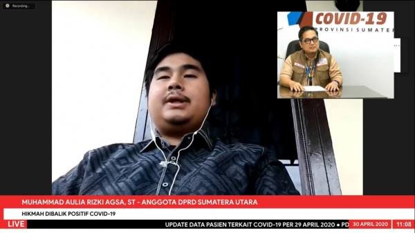 Berbagi kisah, Aulia menceritakan pengalaman dan hikmah yang ia peroleh selama menjalani perawatan, Kamis (30/4), melalui konferensi video secara live pada Media Center Gugus Tugas Percepatan Penanganan (GTPP) Covid-19 Provinsi Sumut, Kantor Gubsu Jalan Diponegoro Nomor 30 Medan. Dialog dipandu oleh Jubir GTPP Covid-19 Sumut, Aris Yudhariansyah.