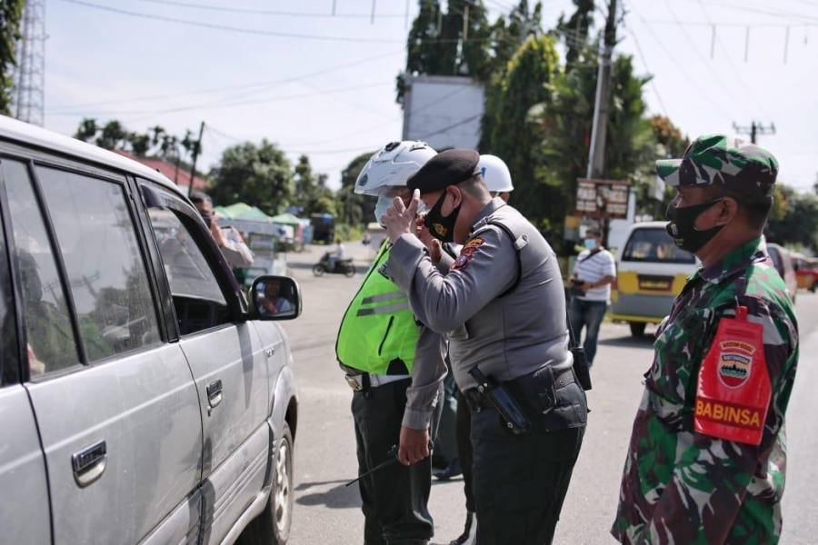 Medan, POL | Penyekatan di sejumlah titik masuk Kota Medan terus berlanjut. Seluruh kendaraan bermotor yang akan masuk Kota Medan diperiksa oleh Petugas gabungan. Di pintu masuk kota Medan jalan Jamin Ginting, Kecamatan Medan Tuntungan, Minggu (6/6/2021). Puluhan kendaraan diberhentikan dan satu persatu pengemudi maupun penumpang diperiksa suhu tubuhnya.