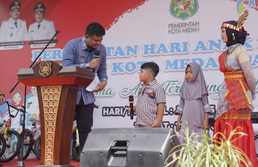 Medan, POL | Dalam puncak Peringatan Hari Anak Nasional tingkat Kota Medan tahun 2022 yang diadakan di Lapangan Cadika, Kecamatan Medan Johor, Jumat (5/8/2022), Wali Kota Medan Bobby Nasution memberikan sejumlah hadiah berupa sepeda kepada anak-anak yang berhasil menjawab pertanyaan. Dengan penuh antusias setiap anak yang ditunjuk maju ke depan menjawab dengan benar setiap pertanyaan Wali Kota Medan Bobby Nasution.