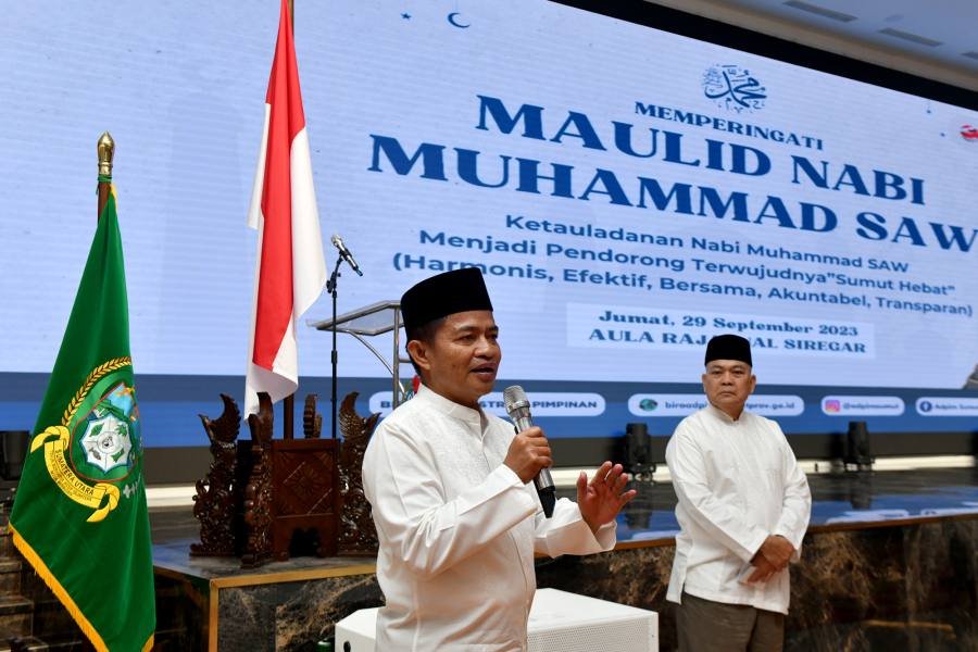 “Kita umat Islam haruslah senantiasa mengikuti dan meneladani kepribadian Nabi Muhammad SAW,” kata Hassanudin, saat peringatan Maulid Nabi di Aula Raja Inal Siregar, Kantor Gubernur, Jalan Diponegoro Nomor 30, Medan, Jumat (29/9/2023).