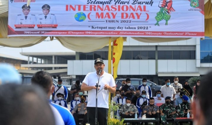 Medan, POL | Pemko Medan menggelar Peringatan Hari Buruh Internasional atau May Day tahun 2022 di Halaman PT Karet Deli, Jalan Yos Sudarso Medan, Minggu (1/5/2022). Berbeda dari tahun-tahun sebelumnya peringatan May Day yang bertepatan menjelang perayaan Hari Raya Idul Fitri 1443 H ini diisi dengan Upacara dan pembagian paket sembako kepada serikat pekerja atau buruh.