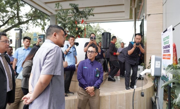 Medan, POL | Wali Kota Medan Bobby Nasution meluncurkan Electric Vechile (EV) Charging Station di Hotel Le Polonia, jalan Jenderal Sudirman, Selasa (30/1/2024). Adanya EV Charging Station di hotel Polonia menjadikan fasilitas umum ini yang pertama di Provinsi Sumut khususnya Kota Medan yang menyediakan stasiun untuk pengisian kendaraan listrik.