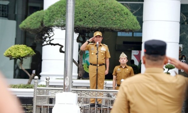 Medan, POL | Penjabat (Pj) Gubernur Sumatera Utara (Sumut) Hassanudin memimpin apel terakhir bersama seluruh Aparatur Sipil Negara (ASN) dan staf di Halaman Kantor Gubernur Sumut, Jalan Pangeran Diponegoro Nomor 30, Medan, Senin (24/6/2024). Hassanudin berpesan kepada ASN, agar setelah ini tetap mendukung Agus Fatoni yang ditunjuk sebagai penggantinya, menjadi Pj Gubernur Sumut.