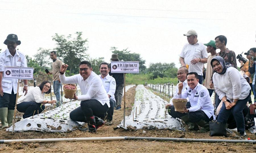 Deliserdang, POL | Pemerintah Provinsi (Pemprov) Sumatera Utara (Sumut) berkomitmen untuk terus menjaga kedaulatan pangan di Sumut. Hal tersebut disampaikan Penjabat (Pj) Gubernur Sumut Agus Fatoni saat mendampingi kunjungan kerja Wakil Menteri Pertanian (Wamentan) Sudaryono meluncurkan Food Estate Mini, sekaligus menanam cabai merah, bawang merah dan jagung perdana di Desa Sena, Deliserdang, Minggu (11/8/2024).