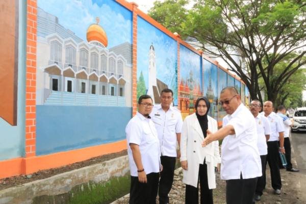 Medan, POL | Plt Wali Kota Medan Ir H Akhyar Nasution MSi mengapresiasi mural (lukisan di dinding/tembok) di Jalan Polonia, Kelurahan Suka Damai Kecamatan Medan Polonia saat meninjau kawasan tersebut, Rabu (18/12/2019).