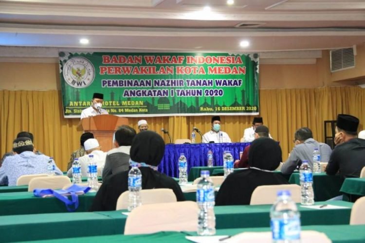 Demikian disampaikan Pelaksana tugas (Plt) Kabag Agama Setda Kota Medan Agus Maryono saat membacakan sambutan Plt Wali Kota Medan Ir H Akhyar Nasution MSi pada acara Pembinaan Nazhir Tanah Wakaf angkatan I Tahun 2020 yang diadakan oleh Badan Pelaksana Perwakilan Badan Wakaf Indonesia (BWI) Kota Medan di Hotel Antares Jalan Sisingamangaraja No 84 Kecamatan Medan Kota, Rabu (16/12/2020).
