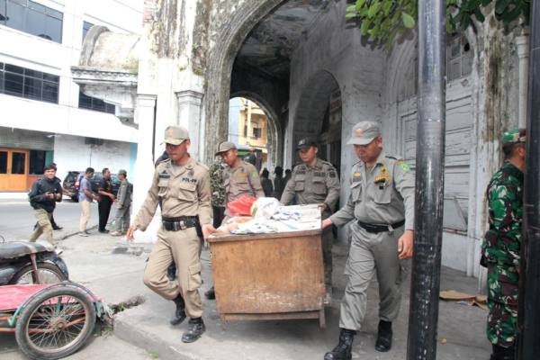 Medan, POL | Proses pengambilalihan Gedung Warenhuis di Jalan Hindu, Kelurahan Kesawan, Kecamatan Medan Barat yang dilakukan Pemko Medan berjalan lancar, Jumat (9/8/2019) siang.  Tanpa perlawanan, puluhan warga meninggalkan gedung bersejarah yang sudah cukup lama mereka huni. Setelah  seluruh penghuni keluar, Pemko Medan melalui  Satpol PP pun menyegel  gedung  yang dulunya merupakan pusat perbelanjaan pertama dan terbesar di Kota Medan dengan memagarnya menggunakan seng disertai garis kuning seperti police line.