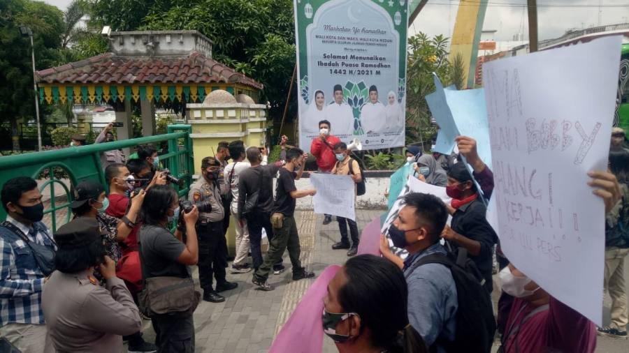 Medan, POL | Puluhan wartawan melakukan unjuk rasa di depan Kantor Wali Kota Medan Jalan Kapten Maulana Lubis, Kamis (15/4/2021), memprotes insiden pengusiran yang dilakukan petugas Satpol PP, Kepolisian dan Paspampres terhadap wartawan saat melakukan tugas peliputan di Balai Kota sehari sebelumnya, Rabu (14/4/2021).
