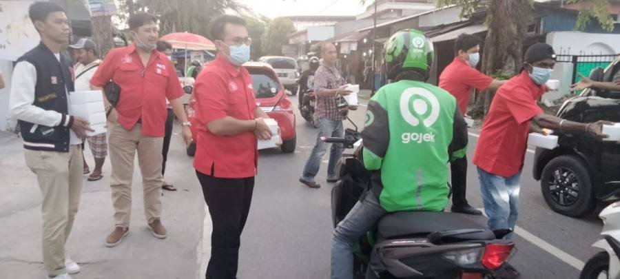 Dengan mematuhi Protokol Kesehatan, pengurus membagikan takjil untuk berbuka puasa kepada pengguna jalan, di depan Kantor DPW PSI Sumut, Jalan Sei Belutu Medan.
