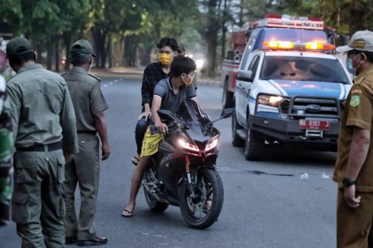 Medan, POL | Puluhan pengendara sepeda motor terjaring ketika Tim Pemantauan dan penertiban Asmara Subuh Pemko Medan melakukan penyisiran dan penertiban di depan eks SPBU Petronas Jalan Ring Road Gagak Hitam Medan, Minggu (9/5/2021). Dalam pemantauan hari terakhir ini, selain tidak mengenakan helm, para pengendara sepeda motor yang terjaring juga tidak mengenakan masker.
