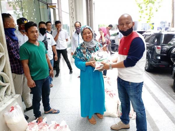 Medan, POL | Wakil Ketua DPRD Sumut Rahmansyah Sibarani memberikan bantuan beras untuk pegawai cleaning service, security dan wartawan unit DPRD Sumut, Kamis (16/4/2020). Pemberian bantuan ini sebagai bentuk kepedulian Rahmansyah di tengah dampak ekonomi akibat pandemi Covid-19.