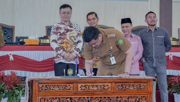 Medan, POL | DPRD Kota Medan menyetujui Rancangan Peraturan Daerah (Ranperda) Kota Medan tentang Penyelenggaraan Perlindungan Anak di Kota Medan yang disampaikan Pemko Medan untuk ditetapkan menjadi Peraturan Daerah (Perda) di Gedung DPRD Medan, Selasa (21/11/2023). Persetujuan ditandai dengan penandatanganan bersama yang dilakukan Ketua DPRD Kota Medan Hasyim SE dan Wali Kota Medan Bobby Nasution.