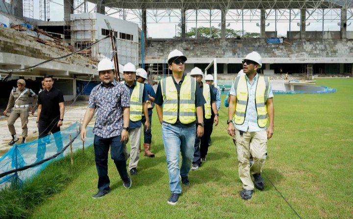 dan meninjau langsung kondisi lapangan serta fasilitas penunjang yang ditargetkan bertaraf internasional. Dari hasil peninjauan, Rico Waas menyebut struktur utama bangunan pada dasarnya telah selesai dan kini tinggal tahap penyempurnaan.