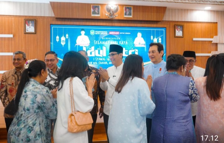 Medan, POL | Wali Kota Medan Rico Tri Putra Bayu Waas menggelar Open House Idulfitri 1446 H di rumah dinasnya, Senin (31/3/2025). Selain unsur Forkopimda, pimpinan parpol, alim ulama, tokoh masyarakat dan agama, pimpinan perangkat daerah, warga juga antusias menghadiri hajatan ini.