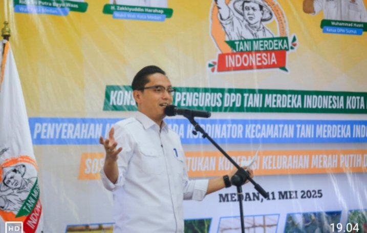 Mandat kepada Koordinator ini diserahkan Rico Waas pada kegiatan yang digelar DPD Tani Merdeka Indonesia Kota Medan sekaligus Konsolidasi Pengurus dan Sosialisasi Pembentukan Koperasi Merah Putih di Aula Kantor UPT Penyuluhan Dinas Ketahanan Pangan, Pertanian dan Perikanan Kota Medan, Jalan Keramat Indah, Medan Denai, Minggu (11/5/2025). Hadir dalam kegiatan tersebut Asisten Ekbang Setda Kota Medan Agus Suriyono, Kadis Ketahanan Pangan, Pertanian dan Perikanan Kota Medan Gelora KP Ginting dan Plt Kabag Prokopim Agha Novrian serta Camat Medan Denai.