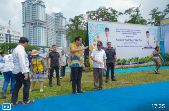 Medan, POL | Di hari terakhir Ramadan, Wali Kota Medan Rico Tri Putra Bayu Waas meninjau lokasi yang akan digunakan untuk melaksanakan Salat Idul Fitri 1446 H di Lapangan Merdeka Medan, Minggu (30/3/2025). Peninjauan dilakukan untuk melihat sejauhmana persiapan yang telah dilakukan.