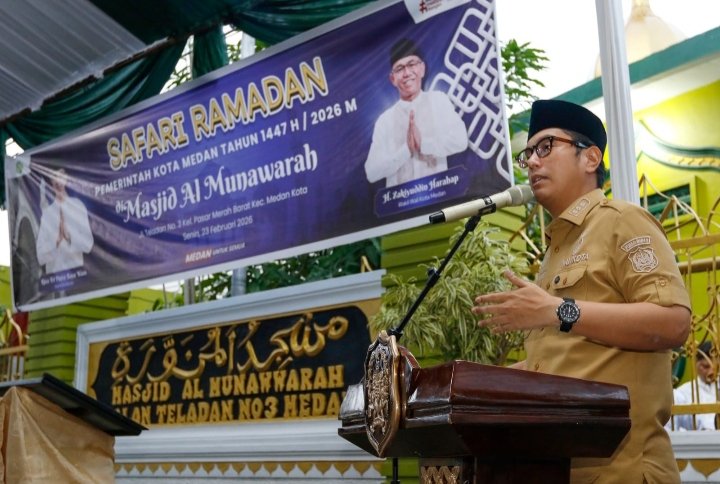 Medan, POL | Wali Kota Medan, Rico Tri Putra Bayu Waas mengawali rangkaian Safari Ramadan Pemko Medan tahun ini dengan penuh khidmat di Masjid Al-Munawwarah, jalan Teladan, Kec. Medan Kota, Senin (23/2/2026).