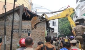 Medan, POL | Penertiban sejumlah bangunan liar yang dilakukan Satpol PP di sekitar gedung tua Warenhuis Jalan Hindu, Kelurahan Kesawan, Kecamatan Medan Barat dalam rangka mendukung penataan kota yang dilakukan Pemko Medan melalui Dinas Perumahan Kawasan Permukiman dan Penataan Ruang (DPKPPR) sempat ricuh, Jumat (13/9/2019). Sejumlah warga yang sudah puluhan tahun mendiami bangunan melakukan perlawanan. Namun perlawanan berhasil diredam, bangunan liar pun akhirnya berhasil dirubuhkan dan diratakan dengan tanah.