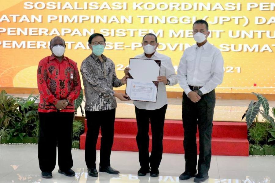 Acara pembukaan sosialisasi ini diakhiri dengan penandatangan fakta integritas penerapan sistem merit oleh Ketua KASN dan Gubsu. (POL/balyan)