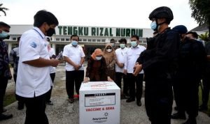 Medan, POL | Sekretaris Daerah Provinsi (Sekdaprov) Sumut R Sabrina menerima 34.840 vial vaksin Covid-19 tambahan dari Pemerintah Pusat, Jumat (15/1/2021). Jumlah tersebut melengkapi 40.000 vaksin yang tiba lebih dulu, Selasa (5/1), sehingga total vaksin Covid-19 yang diterima Sumut sebanyak 74.840 vial vaksin untuk vaksinasi termin pertama.