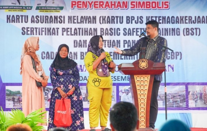 “Saya yakin dan percaya ibu-ibu semua dapat mewujudkan Kampung Nelayan Indah ini menjadi Kampung Pengolahan Ikan,” kata Bobby Nasution saat berdialog dengan warga usai Penyerahan Simbolis Kartu Asuransi Nelayan (Kartu BPJS Ketenagakerjaan), Sertipikat Pelatihan Basic Safety Training (BST) dan Bantuan Pangan Cadangan Beras Pemerintah (BP-CBP) di Kampung Nelayan Indah, Jumat (22/12/2023).