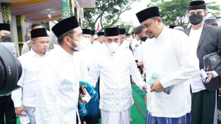 Medan, POL | Wali Kota Medan Bobby Nasution terlihat begitu khusyuk saat menjalankan Shalat Idul Adha di Lapangan Gajah Mada Jalan Krakatau Medan, Minggu (10/7/2022). Selain bersama Wakil Wali Kota Medan H Aulia Rachman, Gubernur Sumut Edy Rahmayadi, Dandim 0201/Medan Kol Inf Ferry Muzawad, Sekda Kota Medan Wiriya Alrahman serta sejumlah pimpinan OPD di lingkungan Pemko Medan juga ikut serta dalam Shalat Idul Adha tersebut.