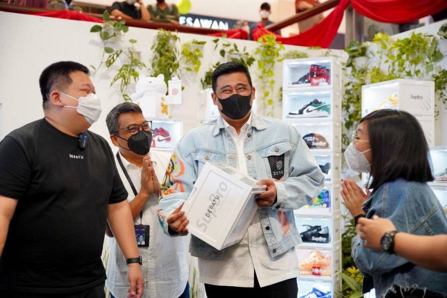 Medan, POL | Wali Kota Medan Muhammad Bobby Afif Nasution mengunjungi pameran produk UMKM yang tergabung dalam startup bernama Depatu di Sun Plaza Medan, Sabtu (12/2/2022). Selain melihat-lihat pameran yang mayoritas menawarkan produk lifestyle tersebut, Bobby juga tampak membeli beberapa produk seperti kaos dan jaket.