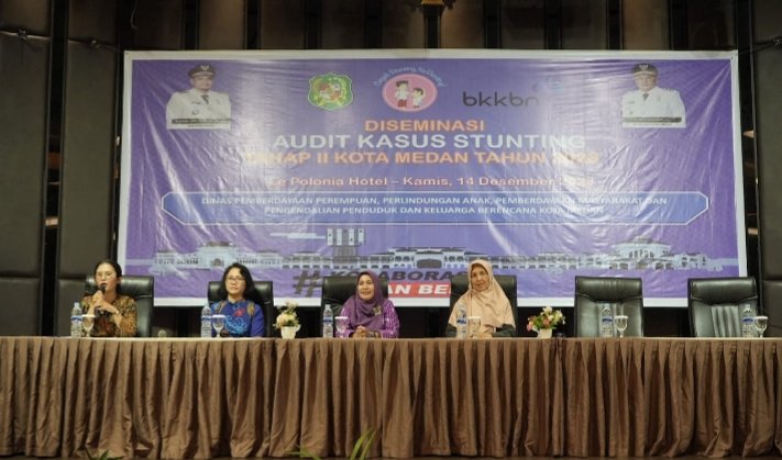 Medan, POL | Pemko Medan melalui Dinas Pemberdayaan Perempuan Perlindungan Anak Pemberdayaan Masyarakat Pengendalian Penduduk dan Keluarga Berencana (P3APMP2KB) menggelar Diseminasi Tahap II Audit Kasus Stunting Tahun 2023, Kamis (14/12/2023) di Hotel Polonia. Kegiatan ini diharapkan menajamkan rekomendasi intervensi spesifik, sensitif, dan pencegahan sehingga penanganan stunting dapat terarah dan efektif.