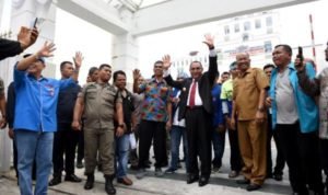 Medan, POL | Gubernur Sumatera Utara (Sumut) Edy Rahmayadi menjumpai para pengunjuk rasa dari kelompok buruh Federasi Serikat Pekerja Niaga, Bank, Jasa dan Asuransi Serikat Pekerja Seluruh Indonesia (FSP NIBA SPSI) Sumut, di depan Kantor Gubernur, Jalan Pangeran Diponegoro, Nomor 30 Medan, Selasa (27/8/2019).