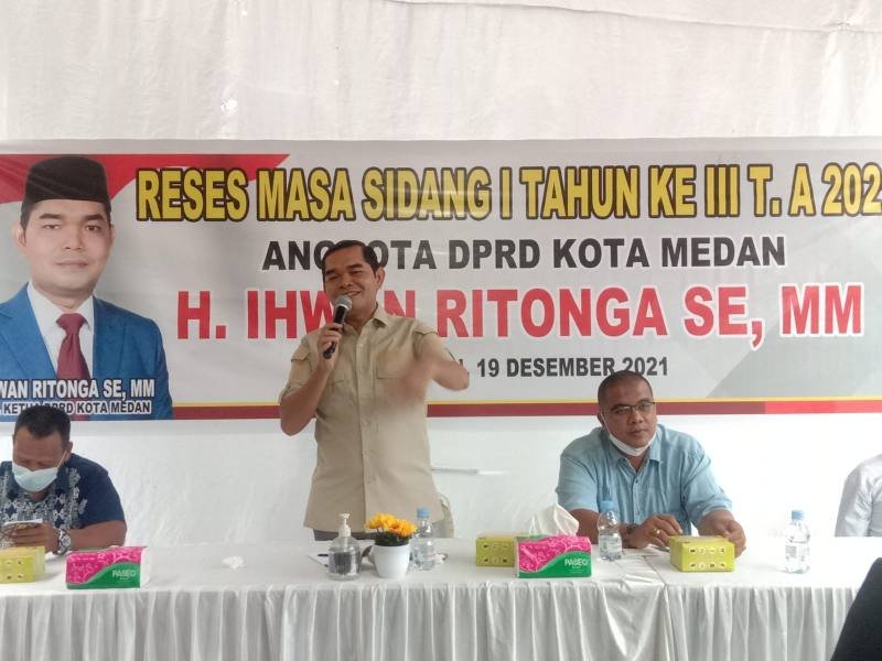 Pernyataan itu disampaikan Ihwan Ritonga disela-sela sambutan pertemuan reses yang digelar di Kantor Lurah Medan Tenggara Jalan Menteng VII/Jalan Rahmad Medan Komplek PIK (Pusat Industri Kecil), Minggu (19/12/2021). Pertemuan reses tersebut digelarnya secara bertahap pada hari yang sama.