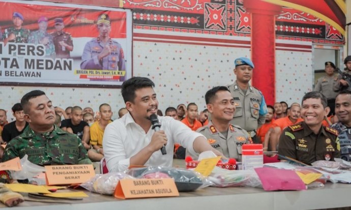 Hal ini disampaikan Bobby Nasution saat menghadiri Konferensi Pers Pelaku Kejahatan Wilayah Polres Pelabuhan Belawan di Aula Polres Pelabuhan Belawan, Jalan Raya Pelabuhan, Jum’at (24/2) petang. Di kesempatan itu, puluhan pelaku kejahatan baik tindakan pencurian disertai kekerasan, penganiayaan hingga menghilangkan nyawa orang lain, tawuran, pencabulan serta penyalahgunaan narkotika turut dihadirkan beserta barang buktinya.