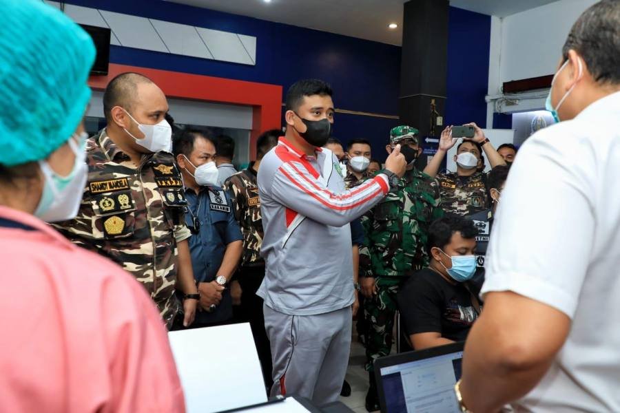 Medan, POL | Wali Kota Medan Bobby Nasution meninjau pelaksanaan vaksinasi berani serbu di Kantor Imigrasi Kelas I TPI Polonia, Jalan Mangkubumi, Medan, Sabtu (23/10/2021). Vaksinasi yang digelar atas kerjasama Generasi Muda Keluarga Besar FKPPI Sumut dan Imigrasi Kelas I TPI Polonia ini menargetkan cakupan 1.000 vaksin.