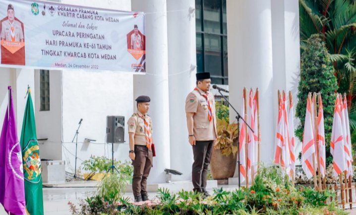 Medan, POL | Penyerahan penghargaan Lencana Dharma Bakti dan Lencana Pancawarsa yang dilakukan Wali Kota Medan Bobby Nasution selaku Ketua Majelis Pembimbing Cabang (Ka Mabicab) Gerakan Pramuka Kota Medan mewarnai jalannya Peringatan Hari Pramuka ke 61 Tahun Tingkat Kwarcab Kota Medan di halaman depan Balai Kota, Jalan Kapten Maulana Lubis Medan, Sabtu (24/12/2022).