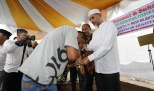 Medan, POL | Wakil Gubernur (Wagub) Sumatera Utara (Sumut) Musa Rajekshah memberikan tali kasih kepada keluarga korban bencana kebakaran pabrik mancis yang terjadi di Binjai beberapa waktu lalu, di Halaman Masjid Nurul Furqon, Binjai Utara, Binjai, Jumat (20/9/2019). Pemberian tali kasih ini bertepatan dengan peresmian Masjid Nurul Furqon.
