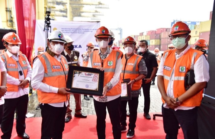 Medan, POL | Wali Kota Medan, Bobby Nasution diwakili Wakil Wali Kota Medan, H. Aulia Rachman menyaksikan langsung pelesapan merdeka ekspor 2021 di Terminal A Peti Kemas, Pelabuhan Gabion Belawan, Sabtu (14/8/2021).