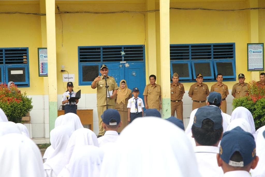 Medan, POL | Wakil Wali Kota Medan Ir H Akhyar Nasution MSi bertindak sebagai pembina upacara pada hari pertama masuk sekolah di SMP Negeri 27 Medan, Jalan Pancing Pasar IV, Kecamatan Medan Tembung, Senin (15/7/2019). Seluruh siswa diharapkan semakin semangat menuntut ilmu guna menjadi generasi penerus bangsa yang unggul dan berdaya saing sehingga mampu memberi kontribusi terbaik bagi bangsa dan negara, khususnya Kota Medan.