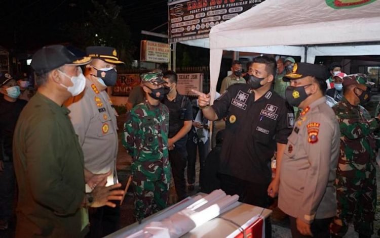 Medan, POL | Bersama Pangdam I BB, Mayjen. TNI Hassanudin, S.I.P., M.M. dan Kapolda Sumut, Irjen. Pol. Drs. RZ Panca Putra S, M.Si., Wali Kota Medan, Muhammad Bobby Afif Nasution, S.E., M.M., melakukan peninjauan ke Lingkungan VII Kelurahan Gedung Johor Kecamatan Medan Johor, Jumat (28/5/2021) malam. Lingkungan ini salah satu yang harus diisolasi karena di sana terdapat enam rumah yang terdiri 14 jiwa yang terpapar Covid-19.