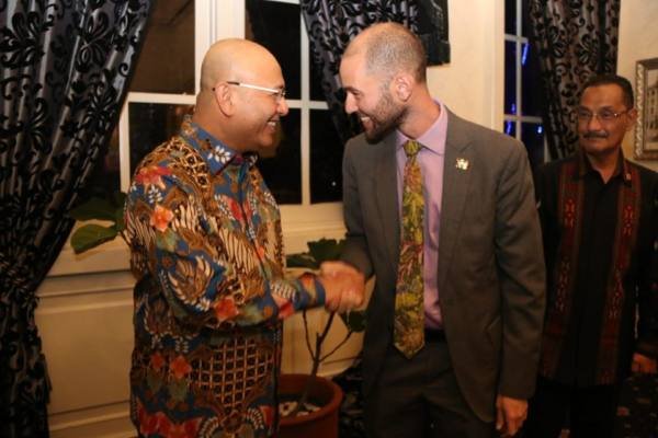Medan POL | Wali Kota Medan Drs H T Dzulmi Eldin S MSi MH menghadiri resepsi dan Perkenalan Konsulat Jenderal (Konjen) Amerika Serikat (AS) untuk Sumatera yang baru Mr Guy Margalith di Heritage Grand Aston Hotel Medan, Kamis (12/9/2019). Acara dirangkaikan dengan peringatan 70 tahun hubungan diplomatik AS dengan Indonesia yang ditandai dengan pemasangan pin kepada Wali Kota dan H Nouval Mahyar SH MHum mewakili Gubsu.