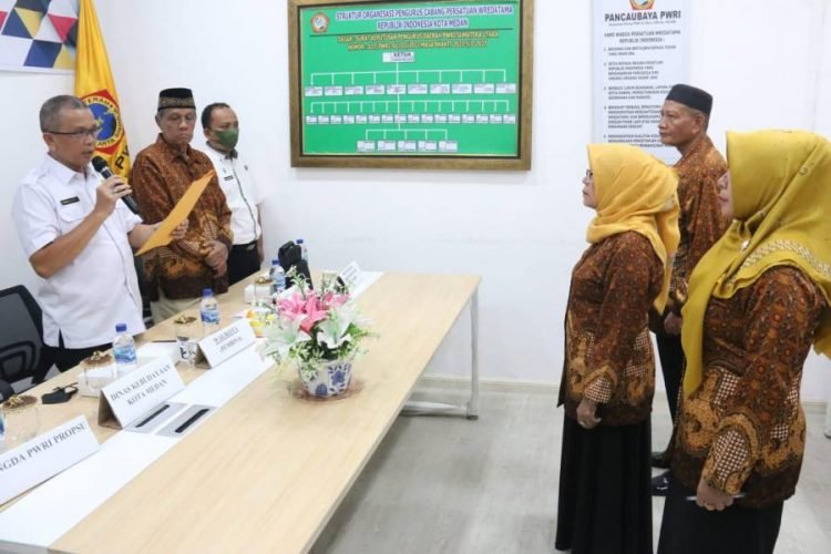 Medan, POL | Wali Kota Medan Bobby Nasution selaku pembina Persatuan Wredatama Republik Indonesia (PWRI) Cabang Kota Medan melantik kepengurusan PWRI cabang Kota Medan periode 2022 s/d 2027. Pelantikan ditandai dengan pembacaan Surat Keputusan oleh Asisten Administrasi Umum Setda Kota Medan, Renward Parapat di Gedung PWRI Kota Medan Jalan Raden Saleh, Rabu (10/8/2022).