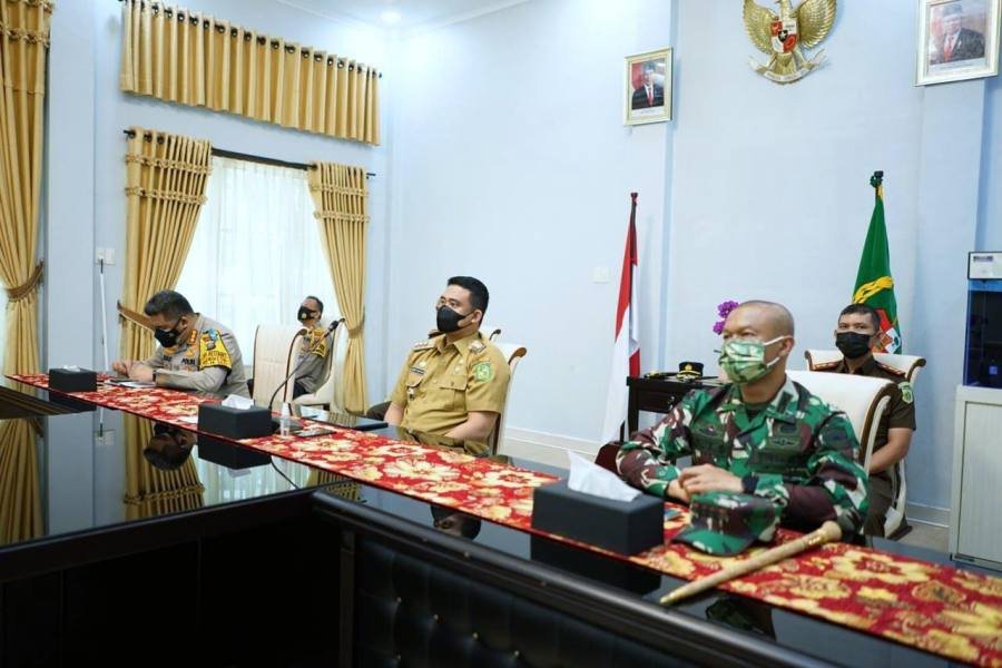 Medan, POL | Wali Kota Medan, Muhammad Bobby Afif Nasution,SE.,MM bersama unsur Forkopimda Kota Medan mengikuti rapat koordinasi penegakan disiplin protokol kesehatan dan penanganan covid-19 secara virtual dari ruang rapat Rumah Dinas Wali Kota Medan, Senin (3/05/2021).
