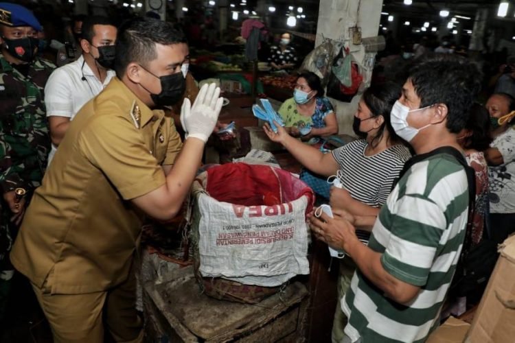 Medan, POL | Wali Kota Medan Muhammad Bobby Afif Nasution SE MM bersama Gubernur Sumut Edy Rahmayadi dan Unsur Forkopimda Sumut membagikan ribuan masker dan hand sanitizer gratis untuk masyarakat di Pasar Petisah, Selasa (30/1/2021). Pembagian Masker ini merupakan langkah preventif dilakukan untuk menekan penyebaran Virus Covid-19 yang masih tinggi sampai saat ini.