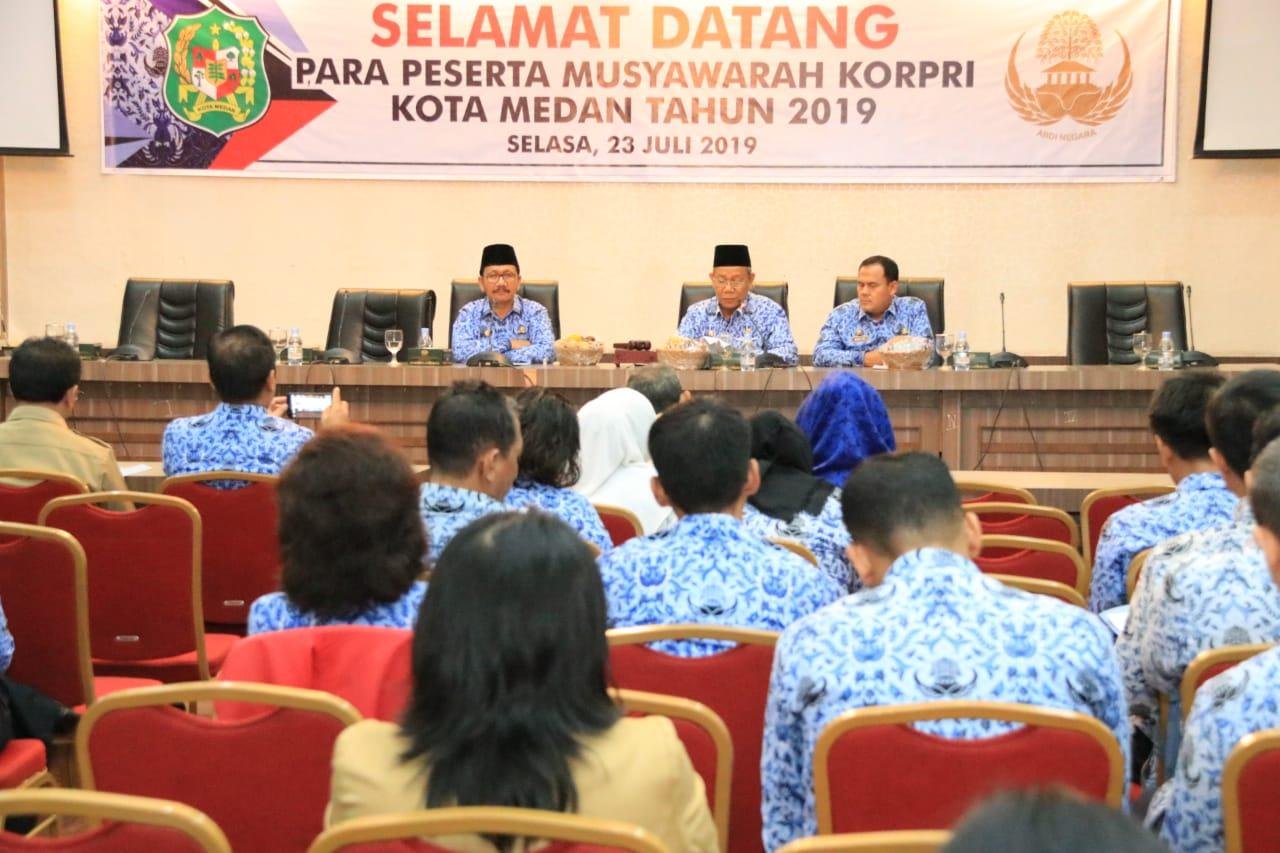 Medan, POL | Wali Kota Medan Drs H T Dzulmi Eldin S MSi MH diwakili Asisten Pemerintahan (Aspem) Kota Medan Musadad membuka Musyawarah Daerah (Musda) Korps Pegawai Republik Indonesia (Korpri) yang berlangsung di Balai Kota, Selasa (23/7/2019). Tujuan Musda ini digelar adalah untuk memilih Ketua Dewan Kepengurusan Korpri Kota Medan Masa Bakti 2019-2024. Dengan demikian Korpri Kota Medan dapat terus menjalankan fungsi dan perannya terhadap masyarakat, bangsa dan negara khususnya Kota Medan.