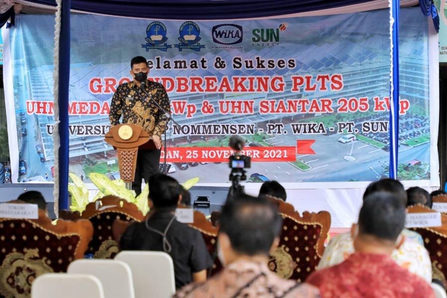Medan, POL | Wali Kota Medan Bobby Nasution menghadiri groundbreaking pembangunan Proyek Pembangkit Listrik Tenaga Surya (PLTS) di Kampus Universitas HKBP Nomensen (UHN), Jalan Sutomo Medan, Kamis (25/11/2021). Diharapkan Listrik solar panel ini selain bermanfaat bagi Kampus UHN khususnya juga dapat bermanfaat bagi masyarakat Kota Medan.