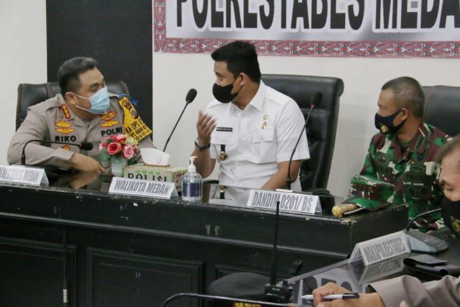 Medan, POL | Wali Kota Medan, Muhammad Bobby Afif Nasution,SE.,MM mengikuti rapat koordinasi lintas sektoral secara virtual dalam rangka mempersiapkan pengamanan menjelang Idul Fitri 1442 H di ruang rupatama Polrestabes Medan, Rabu (21/04/2021).