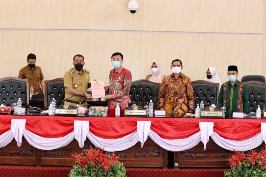 Medan, POL | Wali Kota Medan Bobby Nasution diwakili Wakil Wali Kota H. Aulia Rachman, menyampaikan Tanggapan Wali Kota Medan atas Pemandangan Umum DPRD Medan tentang Rancangan Anggaran Pendapatan Belanja Daerah (RAPBD) Tahun Anggaran TA 2022 dalam Rapat Paripurna DPRD, Senin (22/11/2021) di gedung dewan. Rapat dipimpin Ketua DPRD Medan Hasyim, didampingi Wakil Ketua DPRD Medan H. Ihwan Ritonga, T. Bahrumsyah, Rajudin Sagala, dan diikuti segenap anggota dewan.