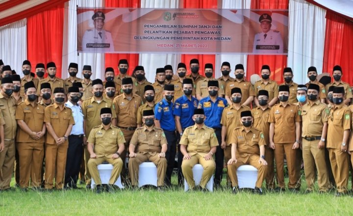 Medan, POL | Wali Kota Medan Bobby Nasution diwakili Sekda Wiriya Alrahman melantik dan mengambil Sumpah Janji 221 Pejabat Pengawas di Lingkungan Pemko Medan, Senin (21/3/2022) di Stadion Kebun Bunga. Diharapkan para pejabat yang dilantik ini dapat bekerja dengan rasa penuh tanggung jawab sesuai dengan ketentuan dan peraturan yang berlaku.
