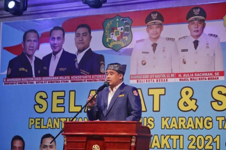 Medan, POL | Wali Kota Medan Muhammad Bobby Afif Nasution SE MM secara resmi melantik dan mengukuhkan Pengurus Karang Taruna Kota Medan periode 2021 – 2026 di Regale Internasional Convention center, jalan Adam Malik, Kamis (27/6). Diharapkan pengurus Karang Taruna Kota Medan yang baru ini dapat menjalin kerjasama dan berkolaborasi dengan Pemko Medan dalam mendukung dan mewujudkan program prioritas Kota Medan.