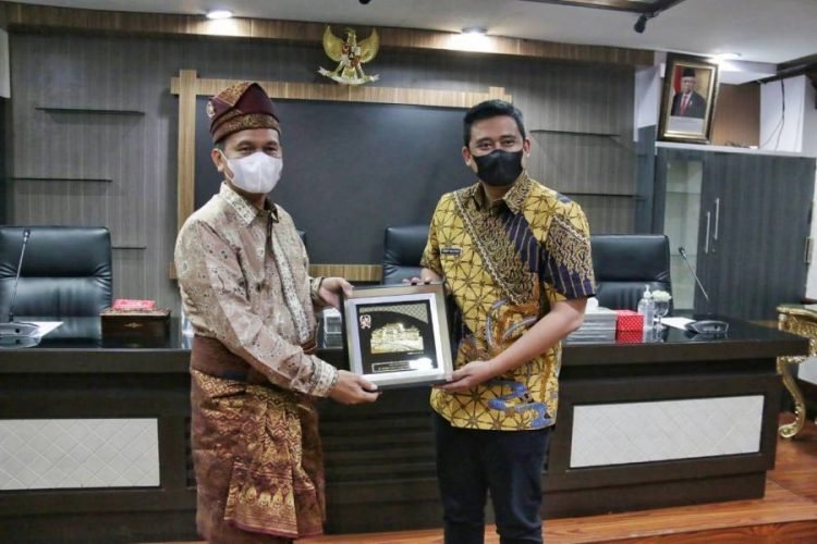 Medan, POL | Wali Kota Medan, Bobby Nasution menerima kunjungan Wali Kota Pariaman, H. Genius Umar di Kantor Wali Kota Medan, Kamis (17/6/2021). Dalam kunjungan, Bobby Nasution menyematkan tengkuluk kepada Genius Umar sebagai bentuk penghormatan dan ucapan selamat datang di Kota Medan.