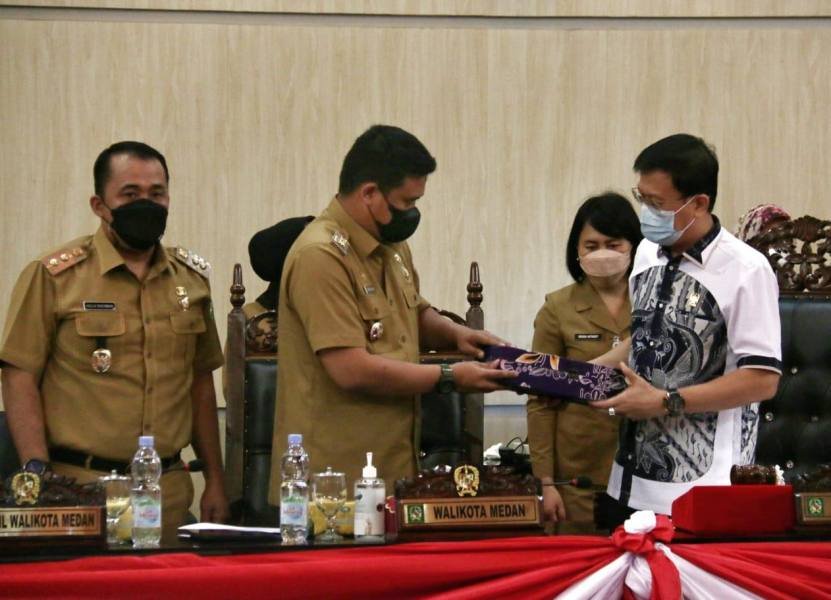 Penyerahan nota pengantar ini juga turut disaksikan oleh Wakil Wali Kota Medan, H. Aulia Rachman,SE, Sekda Kota Medan, Ir. Wiriya Alrahman,MM, dan para anggota dewan serta pimpinan OPD dilingkungan Pemko Medan baik yang hadir secara langsung ataupun melalui sambungan virtual. (POL/COS)