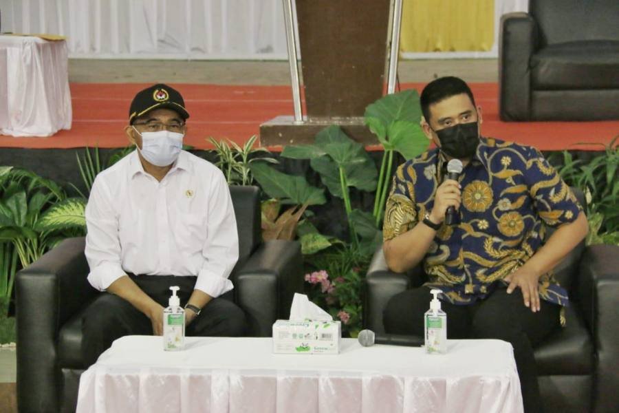 Medan, POL | Wali Kota Medan, Muhammad Bobby Afif Nasution,SE.,MM menyampaikan perkembangan covid-19 di Kota Medan kepada Menteri Koordinator Bidang Pembangunan Manusia dan Kebudayaan (Menko PMK), Prof.Dr.Muhadjir Effendy,M.A.P di Aula PRSU, Sabtu (1/05/2021).